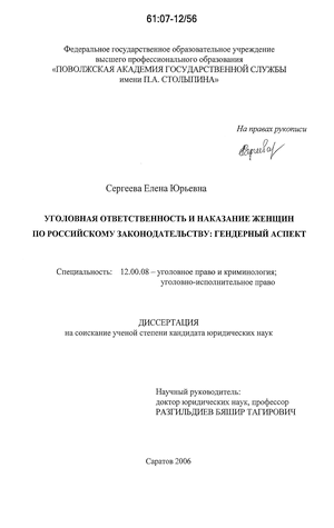 Сергеева Е.Ю. Особенности реализации уголовной ответственности в отношении женщин: тендерный аспект // Вестник Саратовской государственной академии права. 2006. № 4 (49) (0,42 п.л.).