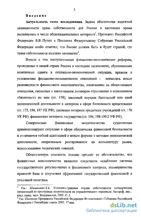 Актуальность темы исследования. Задача обеспечения надежной защищенности права собственности для России в настоящее время выдвинулась в число общенациональных интересов1. Президент Российской Федерации В,В, Путин в Послании Федеральному Собранию Российской Федерации особо отметил, что Россия должна быть и будет страной, где права собственности надежно защищены2.