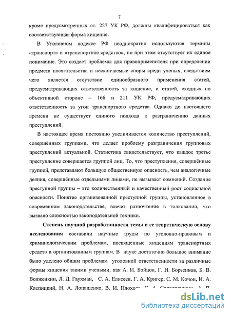 Степень научной разработанности темы и ее теоретическую основу исследования составили научные труды по уголовно-правовым и криминологическим проблемам, посвященные хищениям транспортных средств и организованным группам. В науке достаточно большое внимание было уделено общим проблемам уголовной ответственности за различные формы хищения такими учеными, как А. И. Бойцов, Г. Н. Борзенков, Б. В. Волженкин, Л. Д. Гаухман, С. А. Елисеев, Г. А. Кригер, С. М. Кочои, И. А. Клепицкий, Н. А. Лопашенко, В. И. Плохова, С. А. Солодовников, А. П.