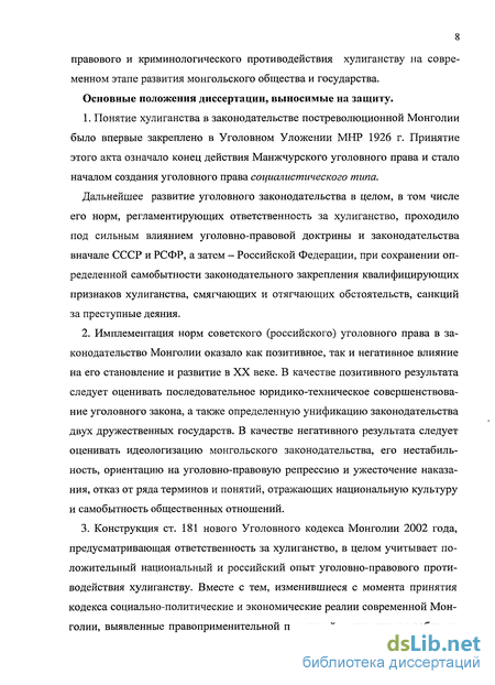 правового и криминологического противодействия хулиганству на современном этапе развития монгольского общества и государства. Основные положения диссертации, выносимые на защиту.