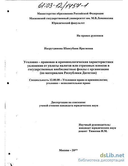 Предмет исследования составляют: современное и ранее действовавшее законодательство об ответственности за уклонение от уплаты обязательных платежей (налогов); практика применения ст. 199 УК РФ; данные, отражающие динамику и структуру налоговых преступлений (по материалам Дагестана); тенденции развития уголовного законодательства об ответственности за уклонение от уплаты налогов или страховых взносов в государственные внебюджетные фонды с организации.