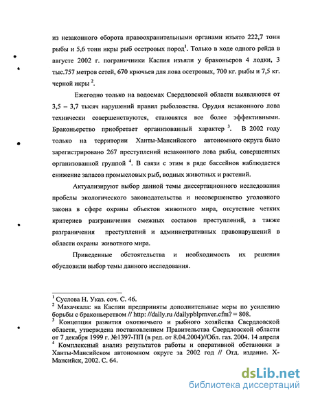 мира, их состоянии, структуре, динамике экологической преступности в России, опубликованные в отчетах уполномоченных государственных органов и иной литературе. При написании работы также были изучены материалы Государственной инспекции рыбоохраны по Свердловской области, статистические данные ГУВД Свердловской области, архив Баевского районного суда Алтайского края и практика Управления внутренних дел Ханты-Мансийского автономного округа, а также разъяснения Пленума Верховного Суда РФ. При рассмотрении темы работы было изучено 27 уголовных дел по браконьерству.
