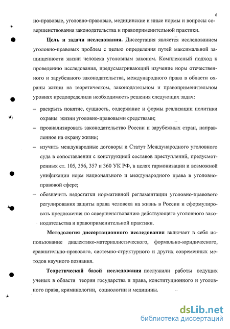 Цель и задачи исследования. Диссертация является исследованием уголовно-правовых проблем с целью определения путей максимальной защищенности жизни человека уголовным законом. Комплексный подход к проведению исследования, предусматривающий изучение норм отечественного и зарубежного законодательства, международного права в области охраны жизни на теоретическом, законодательном и правоприменительном уровнях предопределили необходимость решения следующих задач: