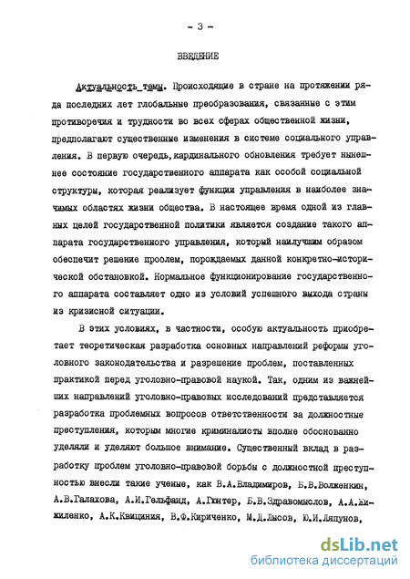 В этих условиях, в частности, особую актуальность приобретает теоретическая разработка основных направлений реформы уголовного законодательства и разрешение проблем, поставленных практикой перед уголовно-правовой наукой. Так, одним из важнейших направлений уголовно-правовых исследований представляется разработка проблемных вопросов ответственности за должностные преступления, которым многие криминалисты вполне обоснованно уделяли и уделяют большое внимание. Существенный вклад в разработку проблем уголовно-правовой борьбы с должностной преступностью внесли такие ученые, как В.А.Владимиров, Б.В.Волженкин, А.В.Галахова, А.И.Гельфанд, А.Гюнтер, Б.В.Здравомысдов, А.А.Жи-жиленко, А.К.КВИЦИНИЯ, В.Ф.Кириченко, М.Д.Лысов, Ю.И.Ляпунов,