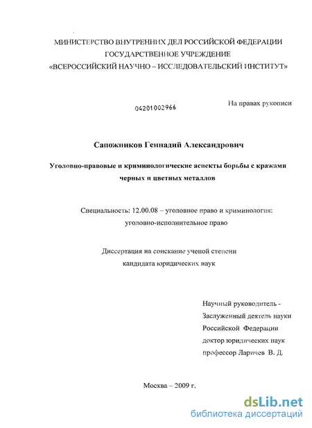 Однако в своих работах они обращались либо к гражданско-правовым вопросам оборота металлов, либо к методике расследования краж металлов, либо к оперативно-розыскным аспектам борьбы с рассматриваемыми преступлениями. Специального монографического исследования, посвященного уголовно-правовым и криминологическим аспекты борьбы с, кражами черных и цветных металлов до настоящего времени не проводилось, чем и определяется актуальность и выбор темы данного исследования.