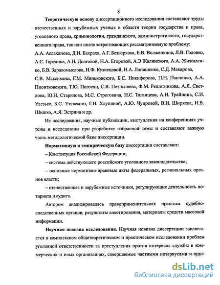 Научная новизна исследования заключается в комплексном общетеоретическом и практическом исследовании проблем уголовной ответственности за преступления против интересов службы в коммерческих и иных организациях, совершаемые частными нотариусами и аудиторами, системном анализе проблем криминализации данных деяний, вопросов квалификации и наказания за указанные преступления.