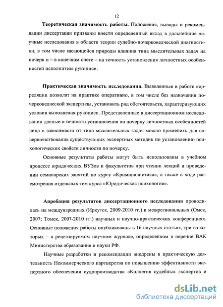9. Исследование рукописи с применением указанных в работе закономерностей поможет следователю получить достоверную ориентирующую (поисковую) информацию о психических свойствах исполнителя рукописи, которая может быть использована для розыска данного лица, а также для выбора тактической линии в процессе проведения следственных действий с его участием. Теоретическая значимость работы. Положения, выводы и рекомендации диссертации призваны внести определенный вклад в дальнейшие научные исследования в области теории судебно-почерковедческой диагностики, в том числе касающейся природы влияния типа мыслительных задач на почерк и - в конечном счете - на точность установления личностных особенностей исполнителя рукописи.