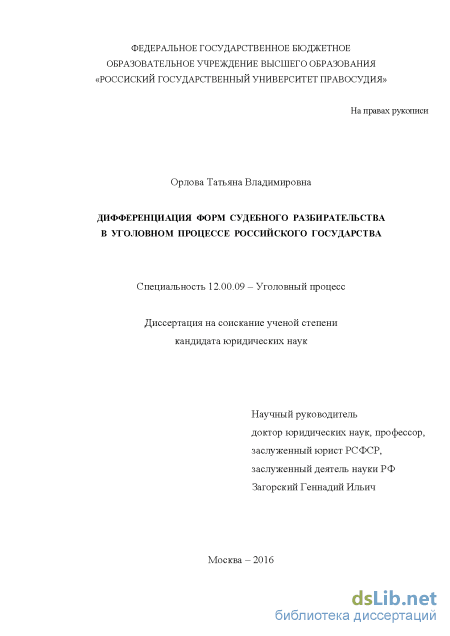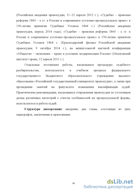 Апробация результатов исследования. По теме диссертационного исследования опубликована монография «Дифференциация форм судебного разбирательства в уголовном процессе Российского государства». Всего по теме диссертации опубликовано 15 статей в ряде изданий, в том числе в четырех журналах, рекомендованных ВАК для публикации результатов научных исследований.