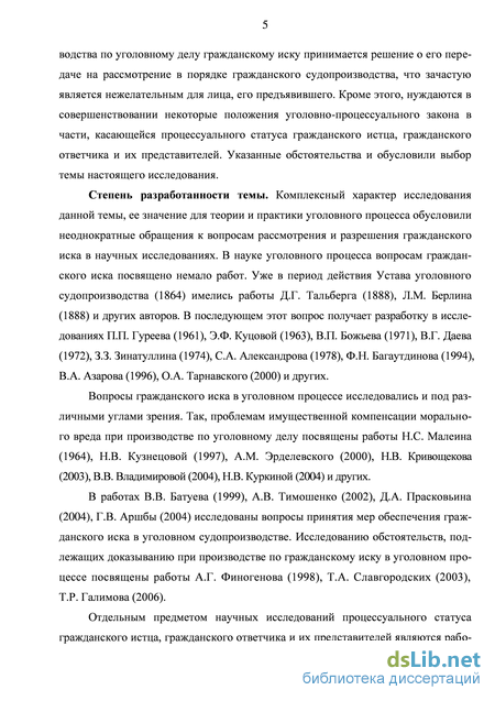 Степень разработанности темы. Комплексный характер исследования данной темы, ее значение для теории и практики уголовного процесса обусловили неоднократные обращения к вопросам рассмотрения и разрешения гражданского иска в научных исследованиях. В науке уголовного процесса вопросам гражданского иска посвящено немало работ. Уже в период действия Устава уголовного судопроизводства (1864) имелись работы Д.Г. Тальберга (1888), Л.М. Берлина (1888) и других авторов. В последующем, этот вопрос получает разработку в исследованиях П.П. Гуреева (1961), Э.Ф. Куцовой (1963), В.П. Божьева (1971), В.Г. Даева (1972), З.З. Зинатуллина (1974), С.А. Александрова (1978), Ф.Н. Багаутдинова (1994), В.А. Азарова (1996), О.А. Тарнавского (2000) и других.