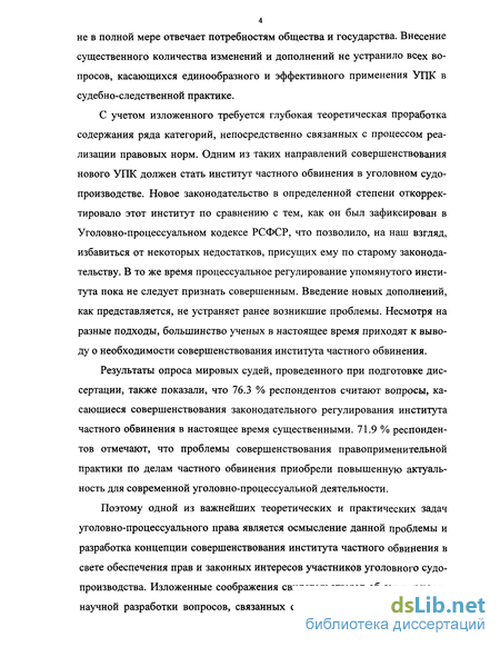 Результаты опроса мировых судей, проведенного при подготовке диссертации, также показали, что 76.3 % респондентов считают вопросы, касающиеся совершенствования законодательного регулирования института частного обвинения в настоящее время существенными. 71.9 % респондентов отмечают, что проблемы совершенствования правоприменительной практики по делам частного обвинения приобрели повышенную актуальность для современной уголовно-процессуальной деятельности.