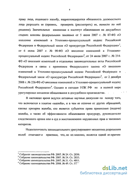 праву лица, подавшего жалобу, корреспондируется обязанность должностного лица разрешить ее (принять, проверить (рассмотреть) ее, вынести по ней решение). Значительные изменения в институт обжалования на досудебных стадиях внесены федеральными законами от 5 июня 2007 г. № 87-ФЗ «О внесении изменений в Уголовно-процессуальный кодекс Российской Федерации и Федеральный закон «О прокуратуре Российской Федерации» , от 6 июня 2007 г. № 90-ФЗ «О внесении изменений в Уголовно-процессуальный кодекс Российской Федерации»2, от 24 июля 2007 г. № 214-ФЗ «О внесении изменений в отдельные законодательные акты Российской Федерации в связи с принятием Федерального закона «О внесении изменений в Уголовно-процессуальный кодекс Российской Федерации и Федеральный закон «О прокуратуре Российской Федерации»3, от 2 декабря 2008 г. № 226-ФЗ «О внесении изменений в Уголовно-процессуальный кодекс Российской Федерации»4. Однако и сегодня УПК РФ не в полной мере урегулировал механизм обжалования в досудебном производстве.