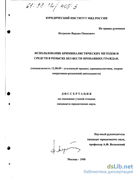 Однако, в большинстве своем, работы названных авторов по предмету данного исследования опубликованы в 70-80-е годы и по этой причине в них не нашли и не могли найти отражение особенностей организации тактики использования криминалистических средств и методов в розыске без вести пропавших и установлении личности погибших граждан по их трупам. Особенности, которые обусловлены коренными изменениями в социально-экономической жизни общества за последние годы. Кроме того, некоторые из этих работ посвящены сугубо научно-техническим аспектам рассматриваемой нами проблемы. Целевое монографическое исследование, вопросов использования по существу в новых условиях криминалистических методов и средств или криминалистического обеспечения розыска без вести пропавших и установления личности погибших граждан пока не проводилось.