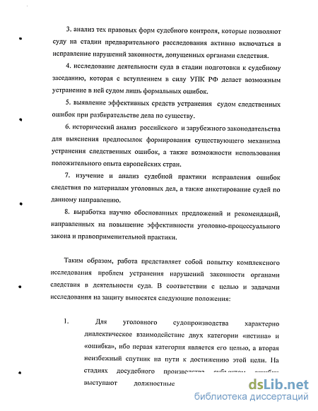 исправлению. Процесс исправления следственных ошибок включает в себя деятельность практически всех участников уголовного судопроизводства. Однако изучение деятельности всех участников, как элементов этого процесса, - глобальное исследование, провести которое в рамках одной работы не представляется возможным. Именно поэтому автор считает целесообразным ограничиться анализом роли одного субъекта уголовного судопроизводства в общем процессе исправления нарушений закона органами следствия. Выбор суда, как субъекта, деятельность которого будет исследоваться, не случаен. Допускаем, что формулировка названия темы диссертационного исследования может вызвать неоднозначную реакцию. Действительно, согласно заложенной парадигме реформирования отечественного уголовного процесса, функция суда - разрешение уголовного дела. Однако из анализа норм УПК РФ следует, что деятельность" суда в уголовном процессе не ограничивается разрешением уголовно-правового спора, существуют полномочия4, которые позволяют суду устранять нарушения закона органами следствия за рамками разрешения дела. Не углубляясь в вопрос, о природе судебного контроля, ибо это тема требует самостоятельного исследования,5 в работе автор исходит из фактического наличия этих полномочий у суда, вследствие закрепления таковых в нормах кодекса. В связи с тем, что с принятием УПК РФ роль суда в процессе исправления