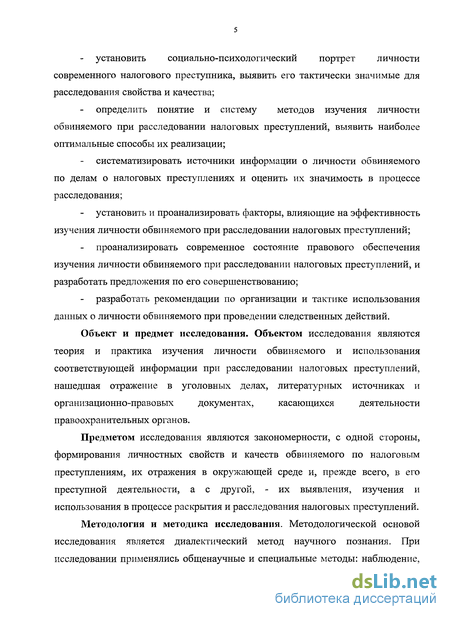 Цель и задачи исследования. Целью исследования является обобщение, анализ и оценка опыта изучения личности обвиняемого при расследовании налоговых преступлений и разработка на этой основе предложений и рекомендаций по организационному, правовому и методическому обеспечению деятельности следователей, осуществляемой в этом направлении.