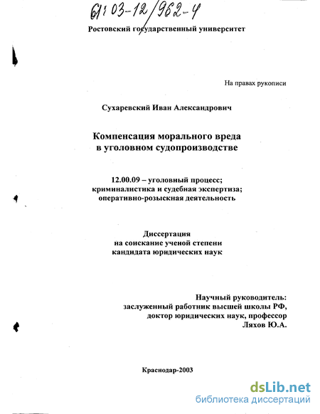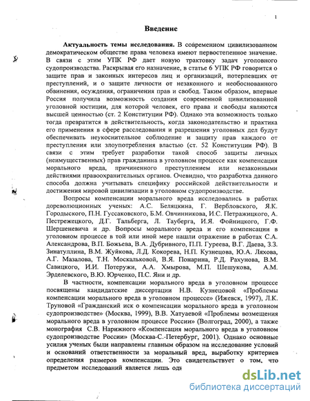 Вопросы компенсации морального вреда исследовались в работах дореволюционных ученых: А.С. Беляцкина, Г. Вербловского, Я.К. Городыского, П.Н. Гуссаковского, Б.М. Овчинникова, И.С. Петражицкого, А. Пестрежецкого, Д.Г. Тальберга, Л. Тауберга, И.Я. Фойницкого, Г.Ф. Шершеневича и др. Вопросы морального вреда и его компенсации в уголовном процессе в той или иной мере нашли отражение в работах С.А. Александрова, В.П. Божьева, В.А. Дубривного, П.П. Гуреева, В.Г. Даева, 3.3. Зинатуллина, В.М. Жуйкова, Л.Д. Кокорева, Н.П. Кузнецова, Ю.А. Ляхова, А.Г. Мазалова, Т.Н. Москальковой, В.Я. Понарина, Р.Д. Рахунова, В.М. Савицкого, И.И. Потеружи, А.А. Хмырова, М.П. Шешукова, A.M. Эрделевского, В.Ю. Юрченко, П.С. Яни и др.