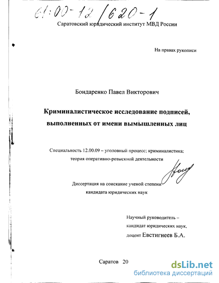 Диссертационная работа ставит целью дальнейшую разработку теоретических и методических основ криминалистического исследования подписей, выполненных от имени вымышленных лиц.