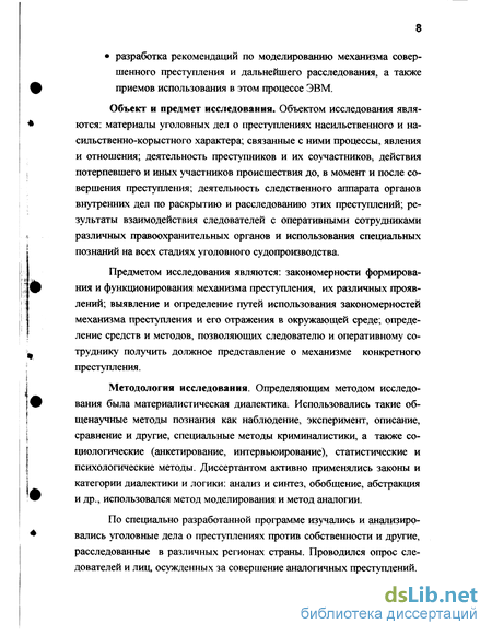 По специально разработанной программе изучались и анализировались уголовные дела о преступлениях против собственности и другие, расследованные в различных регионах страны. Проводился опрос следователей и лиц, осужденных за совершение аналогичных преступлений.