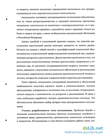 Актуальность настоящего диссертационного исследования обусловливается не только распространенностью и серьезной опасностью преступных сексуальных посягательств на малолетних и несовершеннолетних, но и принятием международно-правовых и российских актов о правовом статусе ребенка и защите его прав, а также особенностями криминогенной обстановки в Российской Федерации.