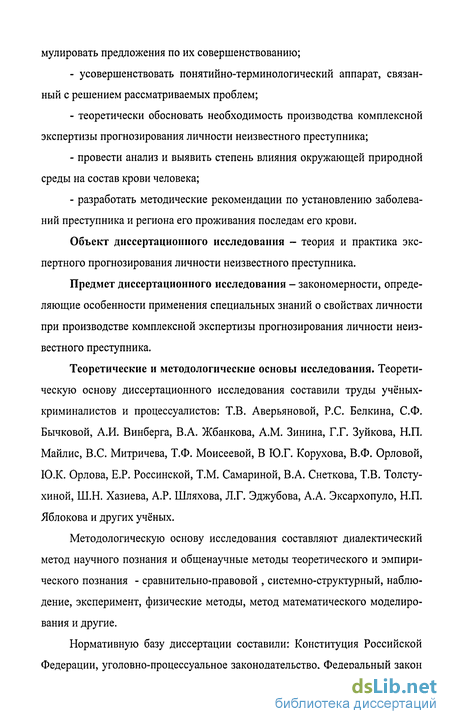 Цель и задачи исследования. Целью настоящего исследования является разработка теоретических основ и практических рекомендаций экспертного прогнозирования личности неизвестного преступника, направленных на совершенствование отдельных вопросов общей теории судебной экспертизы и практики производства комплексной экспертизы прогнозирования личности неизвестного преступника, а также разработка методических рекомендаций по определению имеющихся у него заболеваний и региона его проживания по следам крови, оставленным на месте преступления.