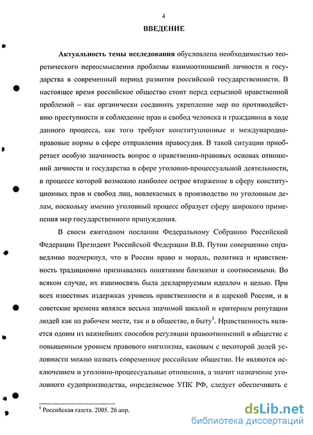 Актуальность темы исследования обусловлена необходимостью теоретического переосмысления проблемы взаимоотношений личности и государства в современный период развития российской государственности. В настоящее время российское общество стоит перед серьезной нравственной проблемой - как органически соединить укрепление мер по противодействию преступности и соблюдение прав и свобод человека и гражданина в ходе данного процесса, как того требуют конституционные и международно-правовые нормы в сфере отправления правосудия. В такой ситуации приобретает особую значимость вопрос о нравственно-правовых основах отношений личности и государства в сфере уголовно-процессуальной деятельности, в процессе которой возможно наиболее острое вторжение в сферу конституционных прав и свобод лиц, вовлекаемых в производство по уголовным делам, поскольку именно уголовный процесс образует сферу широкого применения мер государственного принуждения.