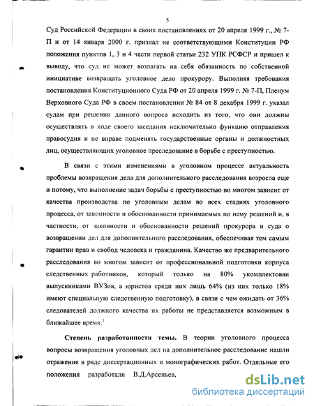 Степень разработанности темы. В теории уголовного процесса вопросы возвращения уголовных дел на дополнительное расследование нашли отражение в ряде диссертационных и монографических работ. Отдельные его положения разработали В.Д.Арсеньев, В.И.Басков, Ф.Ю.Бердичевский,