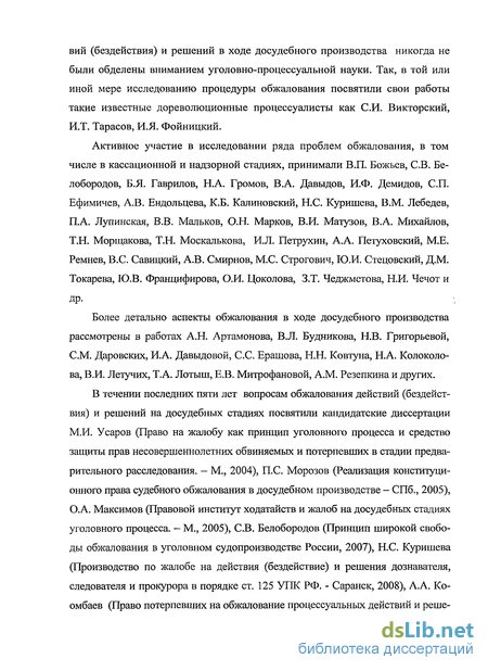В течении последних пяти лет вопросам обжалования действий (бездействия) и решений на досудебных стадиях посвятили кандидатские диссертации М.И. Усаров (Право на жалобу как принцип уголовного процесса и средство защиты прав несовершеннолетних обвиняемых и потерпевших в стадии предварительного расследования. - М., 2004), П.С Морозов (Реализация конституционного права судебного обжалования в досудебном производстве - СПб., 2005), О.А. Максимов (Правовой институт ходатайств и жалоб на досудебных стадиях уголовного процесса. - М., 2005), СВ. Белобородов (Принцип широкой свободы обжалования в уголовном судопроизводстве России, 2007), Н.С Куришева (Производство по жалобе на действия (бездействие) и решения дознавателя, следователя и прокурора в порядке ст. 125 УПК РФ. - Саранск, 2008), А.А. Ко-омбаев (Право потерпевших на обжалование процессуальных действий и реше-