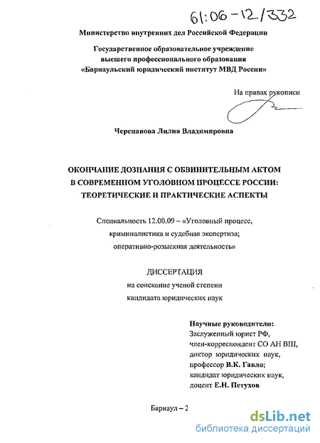 Вместе с тем теоретические основы завершения дознания с обвинительным актом и проблемы его правового регулирования не подвергались само стоятельному монографическому исследованию, и достигнутый уровень научной разработки темы, на наш взгляд, не может считаться достаточным.