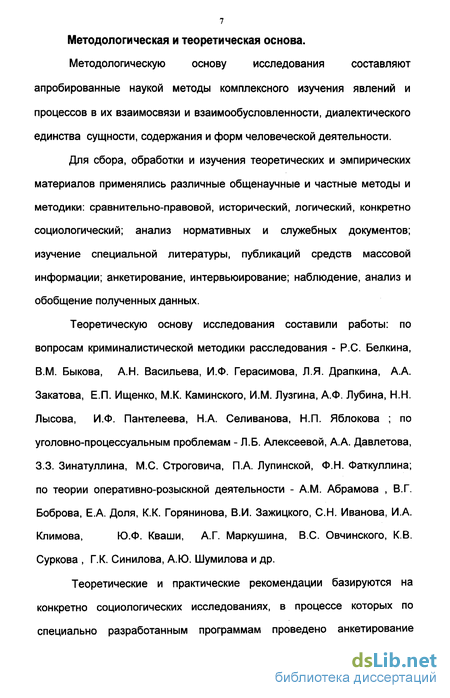 Теоретическую основу исследования составили работы: по вопросам криминалистической методики расследования - Р.С, Белкина, В.М. Быкова, А.Н. Васильева, И.Ф. Герасимова, Л.Я. Драпкина, А.А. Закатова, Е.П. Ищенко, М.К. Каминского, ИМ. Лузгина, А.Ф. Лубина, Н.Н. Лысова, И.Ф. Пантелеева, Н.А. Селиванова, Н.П. Яблокова ; по уголовно-процессуальным проблемам - Л.Б. Алексеевой, А.А. Давлетова, 3.3. Зинатуллина, М.С. Строговича, П.А. Лупинской, Ф.Н. Фаткуллина; по теории оперативно-розыскной деятельности - A.M. Абрамова , В.Г. Боброва, Е.А. Доля, К.К. Горянинова, В.И. Зажицкого, С.Н. Иванова, И.А. Климова, Ю.Ф. Кваши, А.Г\ Маркушина, B.C. Овчинского, КВ. Суркова , Г.К. Синилова, А.Ю. Шумилова и др.
