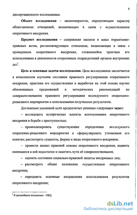 Предмет исследования - содержание законов и иных нормативно-правовых актов, регламентирующих отношения, возникающие в связи с проведением оперативного внедрения, сложившейся практики его использования в деятельности оперативных подразделений органов внутренних дел1.