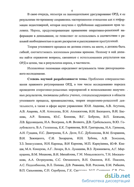 Степень научной разработанности темы. Проблемам совершенствования правового регулирования ОРД, в том числе исследованию порядка проведения оперативно-розыскных мероприятий и использованию полученных результатов, посвящены работы ученых, специализирующихся в области уголовного процесса, криминалистики, теории оперативно-розыскной деятельности, а также в сфере науки управления: Ю.И. Авдеева, А.В. Агутина, А.В. Азарова, А.И. Алексеева, В.М. Атмажитова, И.И. Басецкого, В.И. Бас-кова, А.Р. Белкина, Ю.С. Блинова, В.Г. Боброва, В.П. Божьева, Л.В. Брусницына, И.А. Возгрина, А.Ф. Возного, Д.В. Гребельского, В.Ю. Го-лубовского, В.А. Голенкова, К.К. Горяинова, В.Н. Григорьева, Н.А. Громова, А.Н. Гущина, П.С. Дмитриева, Е.А. Доли, Е.С. Дубоносова, В.М. Егоршина, В.И. Зажицкого, СИ. Захарцева, И.Н. Зубова, А.В. Земскова, 3.3. Зинатуллина, И.И. Карпеца, В.И Карпова, М.П. Карпушина, Ю.Ф. Ква-ши, М.А. Кокорева, А.Г. Лекаря, В.А. Лукашева, В.З. Лукашевича, А.Г. Мар-кушина, В.М. Мешкова, В.И. Михайлова, Г.М. Миньковского, Т.Н. Москаль-кова, А.А. Остроумова, С.С. Овчинского, В.Н. Омелина, Н.Е. Павлова, А.С. Подшибякина, В.Л. Попова, Д.В. Ривмана, В.И. Рохлина, Е.М. Рябкова, В.П. Сальникова, СП. Сереброва, Г.К. Синилова, М.П. Смирнова, СВ. Сте-