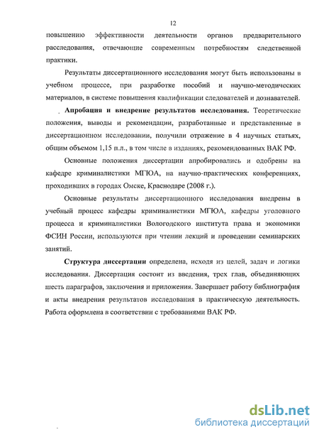 Основные результаты диссертационного исследования внедрены в учебный процесс кафедры криминалистики МГЮА, кафедры уголовного процесса и криминалистики Вологодского института права и экономики ФСИН России, используются при чтении лекций и проведении семинарских занятий.