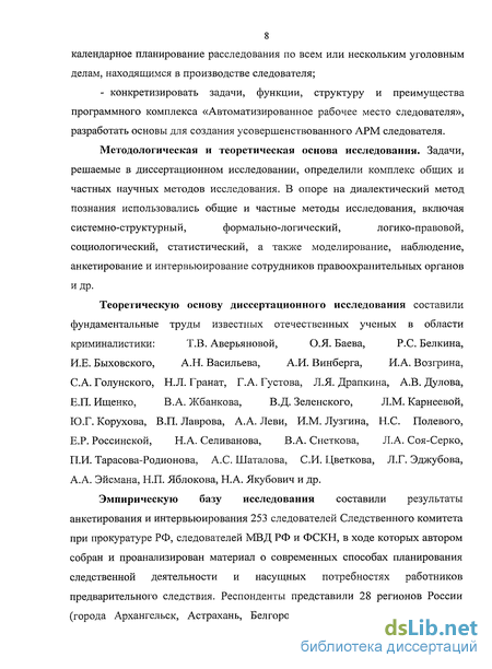 Степень научной разработанности темы исследования. Вопросы, связанные с организацией и планированием следственной деятельности, широко представлены в юридической литературе. Существенный вклад в разработку различных аспектов данной проблематики внесли такие ученые, как: Т.В. Аверьянова, В.П. Антипов, Г.В. Арцишевский, О.Я. Баев, Р.С. Белкин, А.Н. Васильев, С.А. Величкин, А.И. Винберг, И.А. Возгрин, С.А. Голунский, В.И.Громов, Л.Я. Драпкин, Л.П. Дубовицкая, А.В.Дулов, Е.П. Ищенко, В.Д. Зеленский, Ю.Г. Корухов, СВ. Кузьмин, И.М. Лузгин, Г.Н. Мудьюгин, А.Р. Ратинов, Е.Р. Российская, Н.А. Селиванов, В.А. Снетков, Л.А. Сергеев, А.Г. Филиппов, Б.М. Шавер, Н.П. Яблоков, Н.А. Якубович и др.