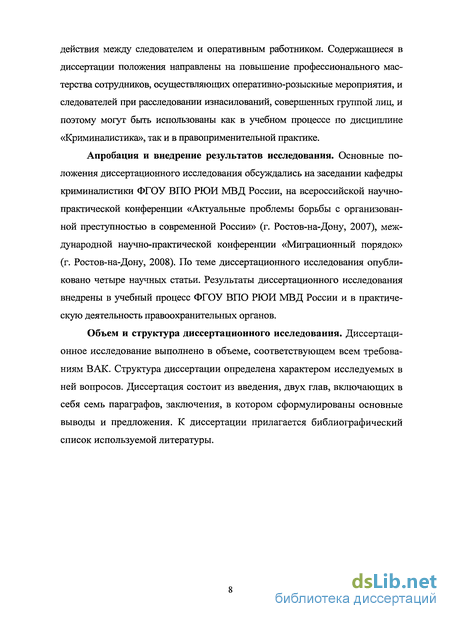 Апробация и внедрение результатов исследования. Основные положения диссертационного исследования обсуждались на заседании кафедры криминалистики ФГОУ ВПО РЮИ МВД России, на всероссийской научно-практической конференции «Актуальные проблемы борьбы с организованной преступностью в современной России» (г. Ростов-на-Дону, 2007), международной научно-практической конференции «Миграционный порядок» (г. Ростов-на-Дону, 2008). По теме диссертационного исследования опубликовано четыре научных статьи. Результаты диссертационного исследования внедрены в учебный процесс ФГОУ ВПО РЮИ МВД России и в практическую деятельность правоохранительных органов.