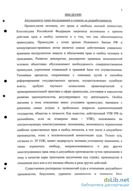 Провозгласив человека, его права и свободы высшей ценностью, Конституция Российской Федерации закрепила положения о прямом действии прав и свобод личности и о том, что они обеспечиваются правосудием. Правосудие с точки зрения Основного Закона РФ и международно-правовых актов является самым действенным социально-правовым инструментом защиты и обеспечения прав и свобод человека и гражданина. Развитие демократии, расширение правовых возможностей человека объективно обусловливают необходимость совершенствования правосудия, укрепления социальной и правовой базы его осуществления. Указанные процессы, сопряженные с поисками путей и способов реформирования государственных органов, осуществляющих судебную власть, требуют научного осмысления правотворческой и правоприменительной практики в сфере правосудия, состояния и перспектив развития законодательства, регулирующего эту деятельность. Особое значение в этом отношении имеет уголовное правосудие, связанное с решением самых острых и проблемных вопросов взаимоотношений государства, общества и личности. Как известно, действующий УПК РФ (в дальнейшем, если не оговорено иное - УПК), основываясь на соответствующих конституционных положениях, возможность ограничения наиболее существенных прав и свобод личности, в том числе в досудебном производстве, отнес к исключительной компетенции суда. Только суд, согласно ст. 29 УПК, может подвергнуть человека уголовному наказанию, а также ограничить свободу, неприкосновенность и ряд других конституционных прав лица в досудебном производстве путем применения к нему в качестве меры пресечения заключения под стражу, производства в отношении него или в его жилище обыска и ряда других действий.