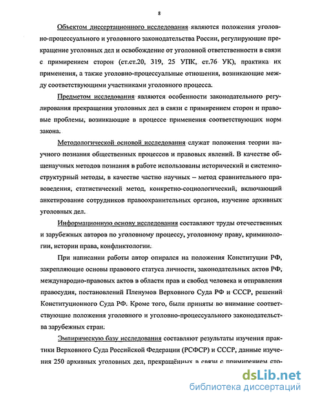 Определение правовых последствий прекращения уголовных дел в соответствии со ст.25 УПК. Объектом диссертационного исследования являются положения уголовно-процессуального и уголовного законодательства России, регулирующие прекращение уголовных дел и освобождение от уголовной ответственности в связи с примирением сторон (ст.ст.20, 319, 25 УПК, ст.76 УК), практика их применения, а также уголовно-процессуальные отношения, возникающие между соответствующими участниками уголовного процесса.