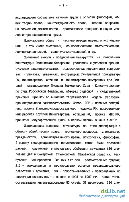 Использована основная литература по теме диссертации в области общей теории права, уголовного процесса, уголовного, гражданского, административного права, психологии, философии. В основу диссертационного исследования также были положены данные, полученные в результате обобщения изученных 426 уголовных дел в Самарской, Ульяновской, Пензенской областях, Республике Башкортостан (из них 117 дел, рассмотренных судами; 211 - находящихся в производстве органов предварительного следствия и дознания; 98 - приостановленных и прекращенных по различным основаниям) в период с 1995 по 1997 гг. Кроме того, осуществлено интервьюирование 83 судей, 31 прокурора, 186 еле-