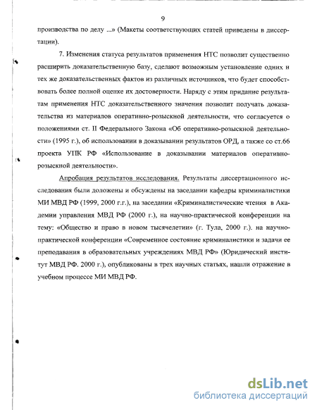 7. Изменения статуса результатов применения НТС позволит существенно расширить доказательственную базу, сделают возможным установление одних и тех же доказательственных фактов из различных источников, что будет способствовать более полной оценке их достоверности. Наряду с этим придание результатам применения НТС доказательственного значения позволит получать доказательства из материалов оперативно-розыскной деятельности, что согласуется о положениями ст. II Федерального Закона «Об оперативно-розыскной деятельности» (1995 г.), об использовании в доказывании результатов ОРД, а также со ст.66 проекта УПК РФ «Использование в доказывании материалов оперативно-розыскной деятельности».