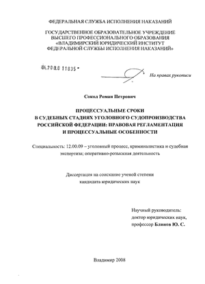 Ряд вопросов, связанных с различными аспектами реализации процессуальных сроков в уголовном судопроизводстве, стали предметом анализа в диссертационных исследованиях: сроки как элемент правового регулирования (Г. Б. Петрова); правовая регламентация процессуальных сроков в досудебном производстве по уголовным делам (И. В. Маслов); защита конституционных прав и свобод личности в российском уголовном процессе (Т. Л. Ко-репанова).