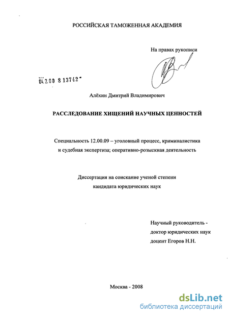 В научных трудах по криминалистике рассматриваются проблемы расследования хищений предметов и документов, имеющих особую ценность (В.М. Первушин, С.А. Приданов, А.П. Резван, А.Р. Усиевич, СП. Щерба и др.), и практически не встречаются работы, посвященные методике расследования хищений научных ценностей. Данная проблематика достаточно сложна и многогранна, в ней еще много невыясненных и дискуссионных вопросов.