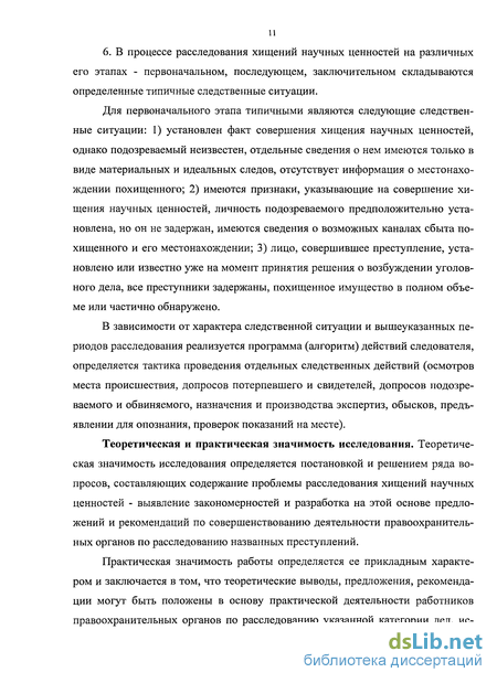 Теоретическая и практическая значимость исследования. Теоретическая значимость исследования определяется постановкой и решением ряда вопросов, составляющих содержание проблемы расследования хищений научных ценностей - выявление закономерностей и разработка на этой основе предложений и рекомендаций по совершенствованию деятельности правоохранительных органов по расследованию названных преступлений.