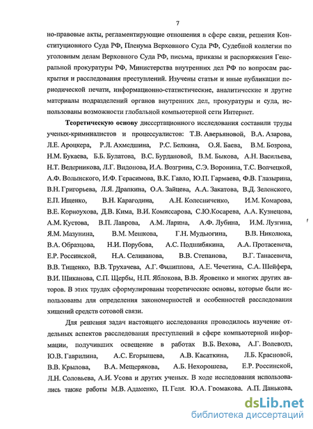А. Образцова, Н.И. Порубова, A.C. Подшибякина, A.A. Протасевича, Е.Р. Российской, H.A. Селиванова, В.В. Степанова, В.Г. Танасевича, В.В. Тищенко, В.В. Трухачева, А.Г. Филиппова, А.Е. Чечетина, С.А. Шейфера, В.И. Шиканова, С.П. Щербы, Н.П. Яблокова, В.В. Яровенко и многих других авторов. В этих трудах сформулированы теоретические основы, которые были использованы для определения закономерностей и особенностей расследования хищений средств сотовой связи.
