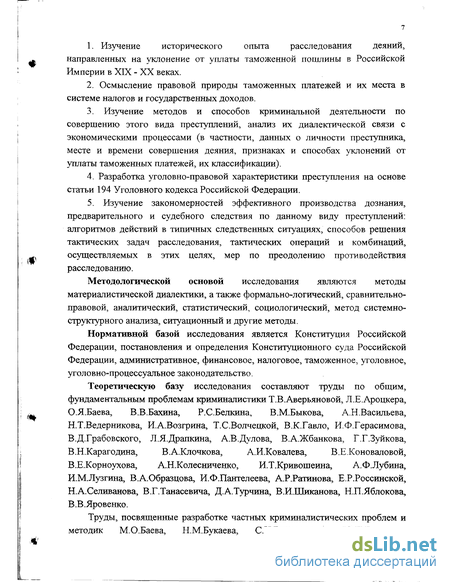 Цель исследования - осмысление отношений, возникающих в процессе подготовки, совершения, сокрытия, обнаружения, раскрытия и расследования уклонений от уплаты таможенных платежей, попадающих под признаки ст. 194 УК РФ, разработка новых эффективных приемов борьбы с преступлениями этого вида технико-криминалистическими средствами, тактическими приемами, посредством современной частной методики расследования.
