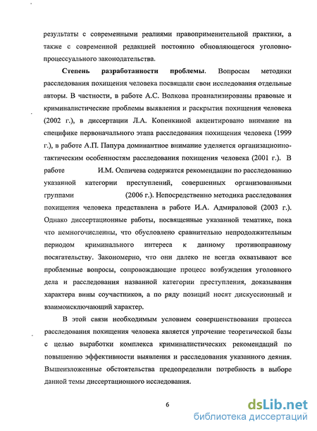 похищения человека представлена в работе И.А. Адмираловой (2003 г.). Однако диссертационные работы, посвященные указанной тематике, пока что немногочисленны, что обусловлено сравнительно непродолжительным периодом криминального интереса к данному противоправному посягательству. Закономерно, что они далеко не всегда охватывают все проблемные вопросы, сопровождающие процесс возбуждения уголовного дела и расследования названной категории преступления, доказывания характера вины соучастников, а по ряду позиций носят дискуссионный и взаимоисключающий характер.