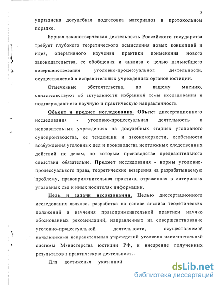 Объект и предмет исследования. Объект диссертационного исследования - уголовно-процессуальная деятельность в исправительных учреждениях на досудебных стадиях уголовного судопроизводства, ее тенденции и закономерности, особенности возбуждения уголовных дел и производства неотложных следственных действий по делам, по которым производство предварительного следствия обязательно. Предмет исследования - нормы уголовно-процессуального права, теоретические воззрения на разрабатываемую проблему, правоприменительная практика, отраженная в материалах уголовных дел и иных носителях информации.