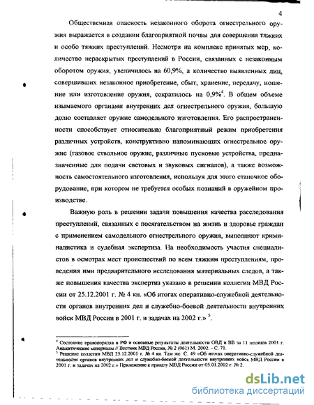 Актуальность темы исследования. На современном этапе в нашей стране в политической, экономической и социальной жизни общества происходят позитивные процессы. Вместе с тем, в последние годы произошло резкое ухудшение криминальной обстановки. Поэтому, перед правоохранительными органами ставится задача усиления борьбы с преступностью, что предполагает повышение качества расследования преступлений, особенно тех, что проявляются в насильственной форме. Если в начале 80-х г. г. умышленным было каждое четвертое убийство, то в настоящее время - каждое второе1. За 11 месяцев 2001 года (по сравнению с аналогичным периодом 2000 г.) в стране зафиксирован рост числа тяжких и особо тяжких преступных посягательств; их совершено 1.6 млн. (+3,2%). Зарегистрировано 30,8 тыс. (+7,3%) умышленных убийств и покушений на убийства, фактов причинения тяжкого вреда здоровью - 51,6 тыс. (+12,9%) . На этом фоне выделилась тенденция увеличения преступлений, совершаемых с применением огнестрельного оружия: в 1989 г. -таких преступлений совершено 18550, в 1993 г. - 21615, в 1994 г., - 31082, в 1995 г. - 29882, в 1996 г. - 34741, в 1997 г. - 41067, в 1998 - 39864, в 1999 -448713. Ситуация остается напряженной и в эти дни. И хотя в 2001 г. количество выявленных преступлений данного вида несколько снизилось (на 0,9%), на территории Южного (+10,9%) и Приволжского (+2,9%) федеральных округов оно возросло, увеличились они и на объектах, обслуживаемых транспортной милицией (+10,7%). В Карачаево-Черкесской республике, Белгородской, Волгоградской областях прирост преступлений данного вида составил от 30 до 45,1%.