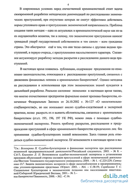 'См.: Белозерова Н. Судебно-бухгалтерская и финансовая экспертизы при расследовании незаконной предпринимательской деятельности//Российский следователь. 2003. - № 8. -С.6-7; Климович Л. П. Возможности судебно-экономической экспертизы в установлении признаков объективной стороны составов преступлений в сфере экономической деятельно-сти//Вестник Тюменского государственного университета.-2004. -№ 1. -С.225-229; Ситни-кова ОТ. Защита экономических интересов в сфере налогообложения и предпринимательства уголовно-правовыми средствами //Юрист. 2003. - №4. - С.58-59; Скрябикова Т. С. Специальные бухгалтерские и экономические познания при расследовании преступле-ний//Сибирский Юридический Вестник, 2001- № З- С.44; Тербулатов А.Х. Преднамеренное банкротство//Законность, 2000. - №2. -С. 16.