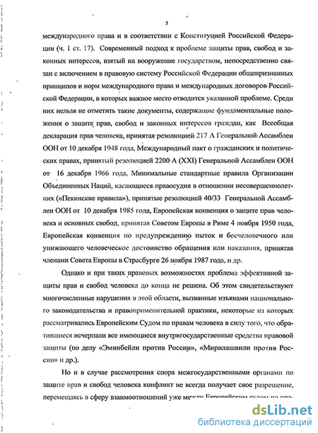 Повышенный интерес государства к проблеме защиты прав и свобод человека и гражданина обусловлен рядом взаимосвязанных обстоятельств, продиктованных заботой о человеке, согласующейся не только с национальными, но и наднациональными взглядам на решение этой проблемы. Они нашли свое выражение в сформулированных в Конституции Российской Федерации основополагающих правилах о том, что человек, его права и свободы являются высшей ценностью (ст. 2); права и свободы человека и гражданина определяют смысл, содержание и применение законов, деятельность законодательной и исполнительной власти, местного самоуправления и обеспечиваются правосудием (ст. 18); права и свободы человека и гражданина в Российской Федерации признаются и гарантируются согласно общепризнанным принципам и нормам международного права и в соответствии с Конституцией Российской Федерации (ч. 1 ст. 17). Современный подход к проблеме защиты прав, свобод и законных интересов, взятый на вооружение государством, непосредственно связан с включением в правовую систему Российской Федерации общепризнанных принципов и норм международного права и международных договоров Российской Федерации, в которых важное место отводится указанной проблеме. Среди них нельзя не отметить такие документы, содержащие фундаментальные положения о защите прав, свобод и законных интересов граждан, как Всеобщая декларация прав человека, принятая резолюцией 217 А Генеральной Ассамблеи ООН от 10 декабря 1948 года, Международный пакт о гражданских и политических правах, принятый резолюцией 2200 А (XXI) Генеральной Ассамблеи ООН от 16 декабря 1966 года, Минимальные стандартные правила Организации Объединенных Наций, касающиеся правосудия в отношении несовершеннолетних («Пекинские правила»), принятые резолюцией 40/33 Генеральной Ассамблеи ООН от 10 декабря 1985 года, Европейская конвенция о защите прав человека и основных свобод, принятая Советом Европы в Риме 4 ноября 1950 года, Европейская конвенция по предупреждению пыток и бесчеловечного или унижающего человеческое достоинство обращения или наказания, принятая членами Совета Европы в Страсбурге 26 ноября 1987 года, и др.