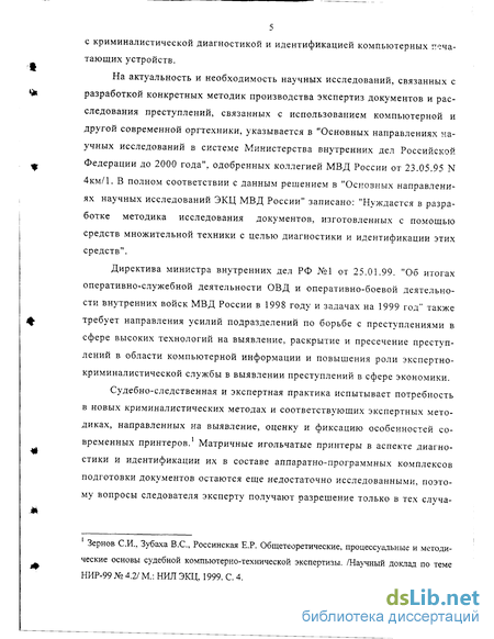 Судебно-следственная и экспертная практика испытывает потребность в новых криминалистических методах и соответствующих экспертных методиках, направленных на выявление, оценку и фиксацию особенностей современных принтеров.1 Матричные игольчатые принтеры в аспекте диагностики и идентификации их в составе аппаратно-программных комплексов подготовки документов остаются еще недостаточно исследованными, поэтому вопросы следователя эксперту получают разрешение только в тех случа Зернов СИ., Зубаха B.C., Российская Е.Р. Общетеоретические, процессуальные и методические основы судебной компьютерно-технической экспертизы. /Научный доклад по теме НИР-99 № 4.2/ М.: НИЛ ЭКЦ, 1999. С. 4.