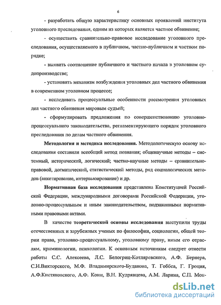 Для достижения указанной цели были поставлены следующие задачи: - выявить исторические закономерности возникновения и становления института частного обвинения в российском уголовном судопроизводстве; разработать общую характеристику основных проявлений института уголовного преследования, одним из которых является частное обвинение; осуществить сравнительно-правовое исследование уголовного преследования, осуществляемого в публичном, частно-публичном и частном порядке; выявить соотношение публичного и частного начала в уголовном судопроизводстве; установить механизм возбуждения уголовных дел частного обвинения в современном уголовном процессе; - исследовать процессуальные особенности рассмотрения уголовных дел частного обвинения мировым судьей; - сформулировать предложения по совершенствованию уголовно- процессуального законодательства, регламентирующего порядок уголовного преследования по делам частного обвинения.