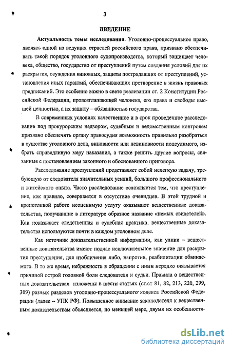 Расследование преступлений представляет собой нелегкую задачу, требующую от следователя значительных усилий, большого профессионального и житейского опыта. Часто расследование осложняется тем, что преступление, как правило, совершается в отсутствие очевидцев. В этой трудной и кропотливой работе неоценимую услугу оказывают вещественные доказательства» получившие в литературе образное название «немых свидетелей». Как показывает следственная и судебная практика, вещественные доказательства используются почти в каждом уголовном деле.